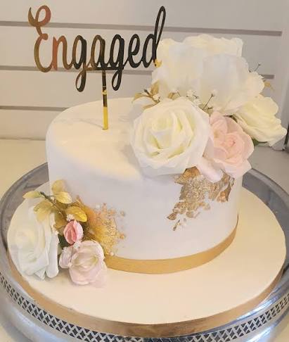 A custom-decorated cake, perfect for engagement or wedding celebrations, combining elegance and delicious flavor.