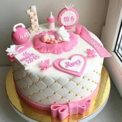 A soft pink baby girl theme cake with elegant fondant detailing and a cute baby topper. Perfect for newborn welcome celebrations. Custom name and message available.